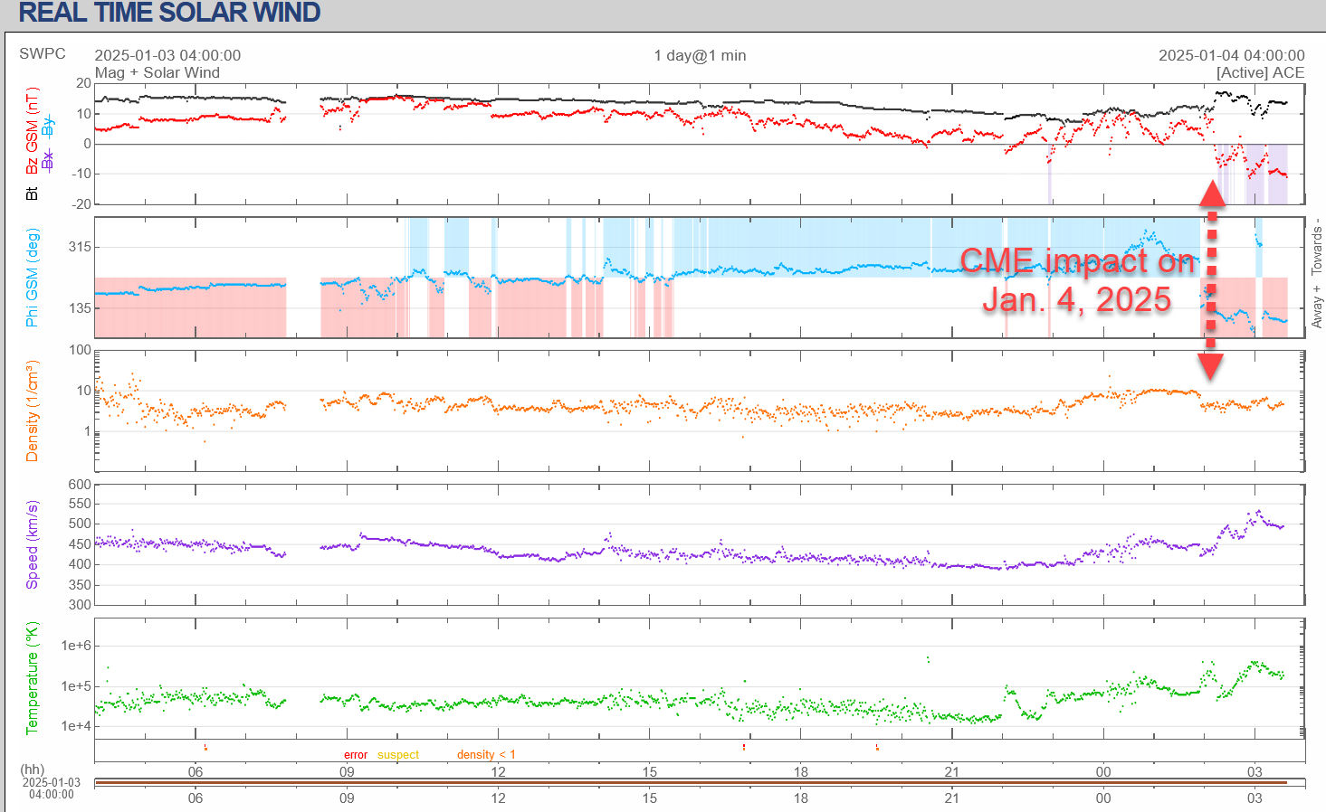 A CME JUST HIT EARTH: Arriving right on time, a CME hit Earth’s magnetic field on Jan. 4th (0445 UTC). The impact could cause G1 (Minor) to G2-class (Moderate) geomagnetic storms in the hours ahead. High-latitude sky watchers should be alert for auroras.